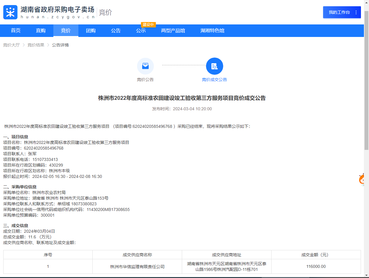 2024年3月4日,“湖南省政府采購(gòu)電子賣(mài)場(chǎng)”發(fā)布《株洲市2022年度高標(biāo)準(zhǔn)農(nóng)田建設(shè)竣工驗(yàn)收第三方服務(wù)項(xiàng)目競(jìng)價(jià)成交公告》,顯示株洲市華信監(jiān)理有限責(zé)任公司成為本項(xiàng)目成交供應(yīng)商。這意味著,我公司喜迎龍年“開(kāi)門(mén)紅”。